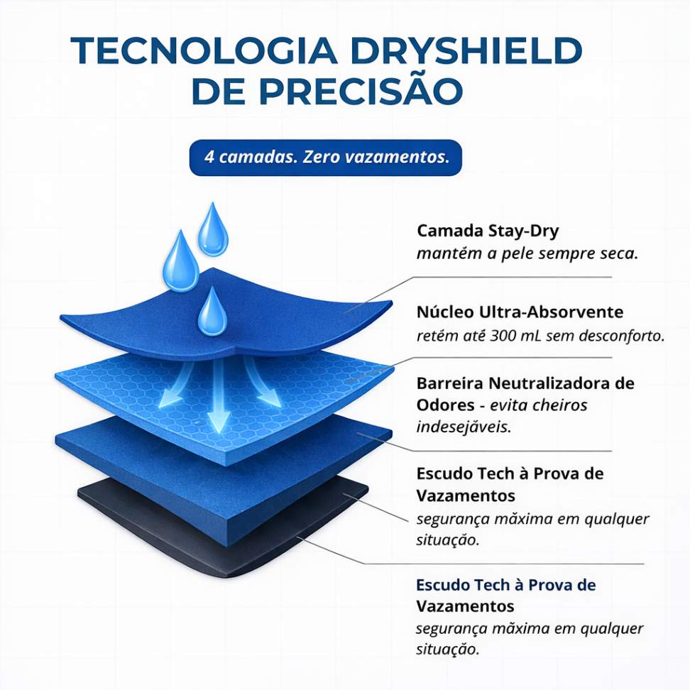 Com um sistema de camadas absorventes de alta eficiência, a cueca boxer ajuda a reter líquidos rapidamente, evitando vazamentos e mantendo a pele mais seca por mais tempo. Isso significa mais conforto e tranquilidade durante todo o dia, mesmo em situações inesperadas.