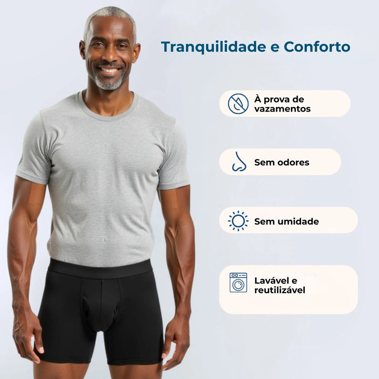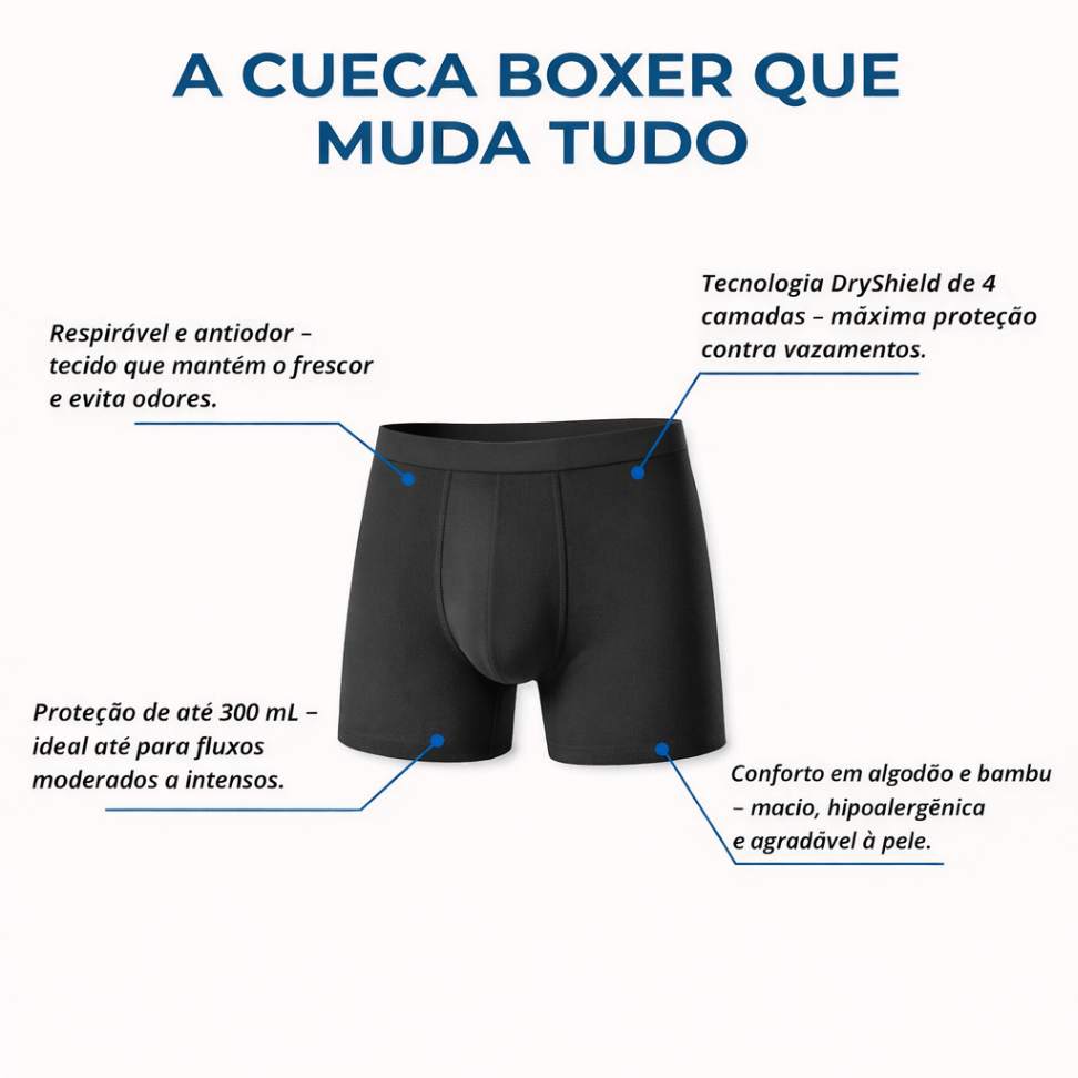 A Cueca Boxer para Incontinência Urinária foi desenvolvida para proporcionar máxima proteção, conforto e discrição, permitindo que você siga sua rotina com mais confiança e tranquilidade. Ideal para quem busca uma solução prática e eficiente para pequenos escapes de urina, este produto une tecnologia de absorção, tecido confortável e design moderno, garantindo segurança sem abrir mão do estilo.